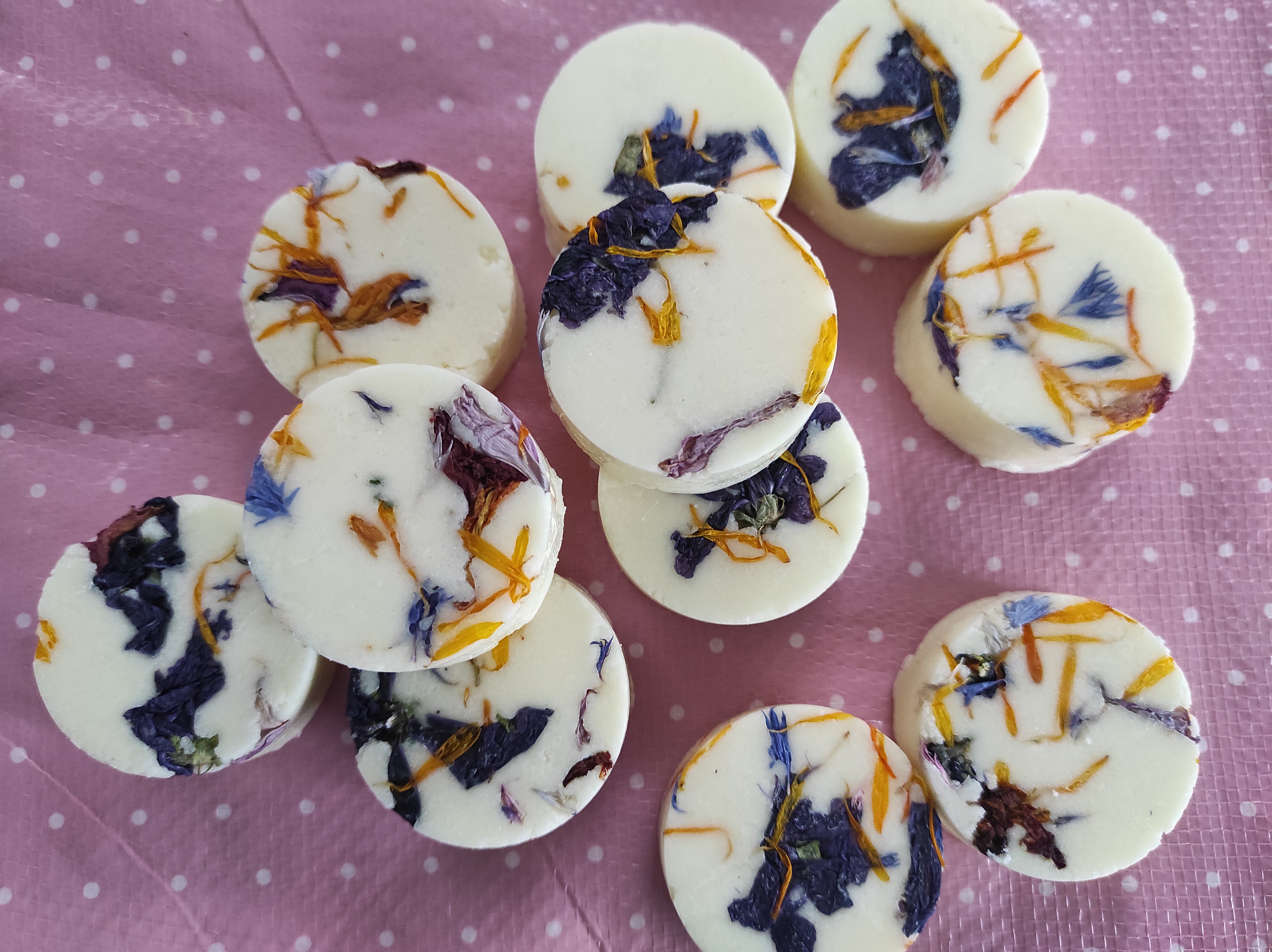 INCI : Sodium bicarbonate, Citric acid, Coco nucifera oil, Zea mays starch, Centaurea cyanus flower, Calendula officinalis flower, Rosa canina flower, Cosmos bipinnatus flower, Tocopherol, Helianthus annuus seed oil