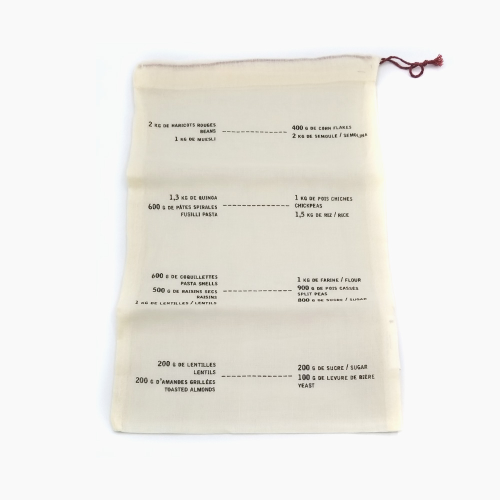 ÉCOLOGIQUES : ces sacs sont réalisés en gaze de coton biologique. Le tissu n’a reçu aucun traitement ; ils sont donc sains pour l’alimentaire. Ils permettent d’éviter les sacs en plastique et même les sachets kraft.