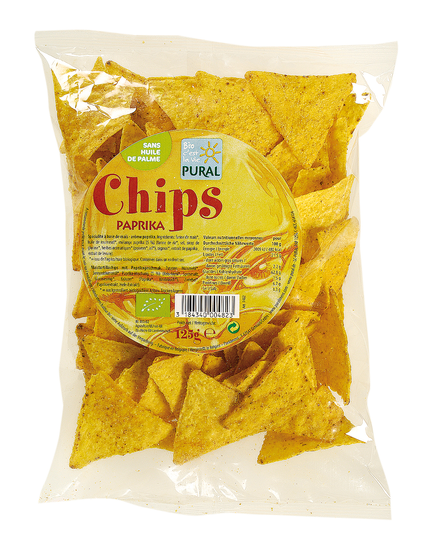 Spécialité à base de maïs - arôme paprika.Ingrédients: Farine de maïs*, huile de tournesol*, mélange paprika* (5%) (farine de riz*, sel, sirop de glucose*, herbes aromatiques* (paprika*, ail*), oignon*, extrait de paprika, extrait de levure)