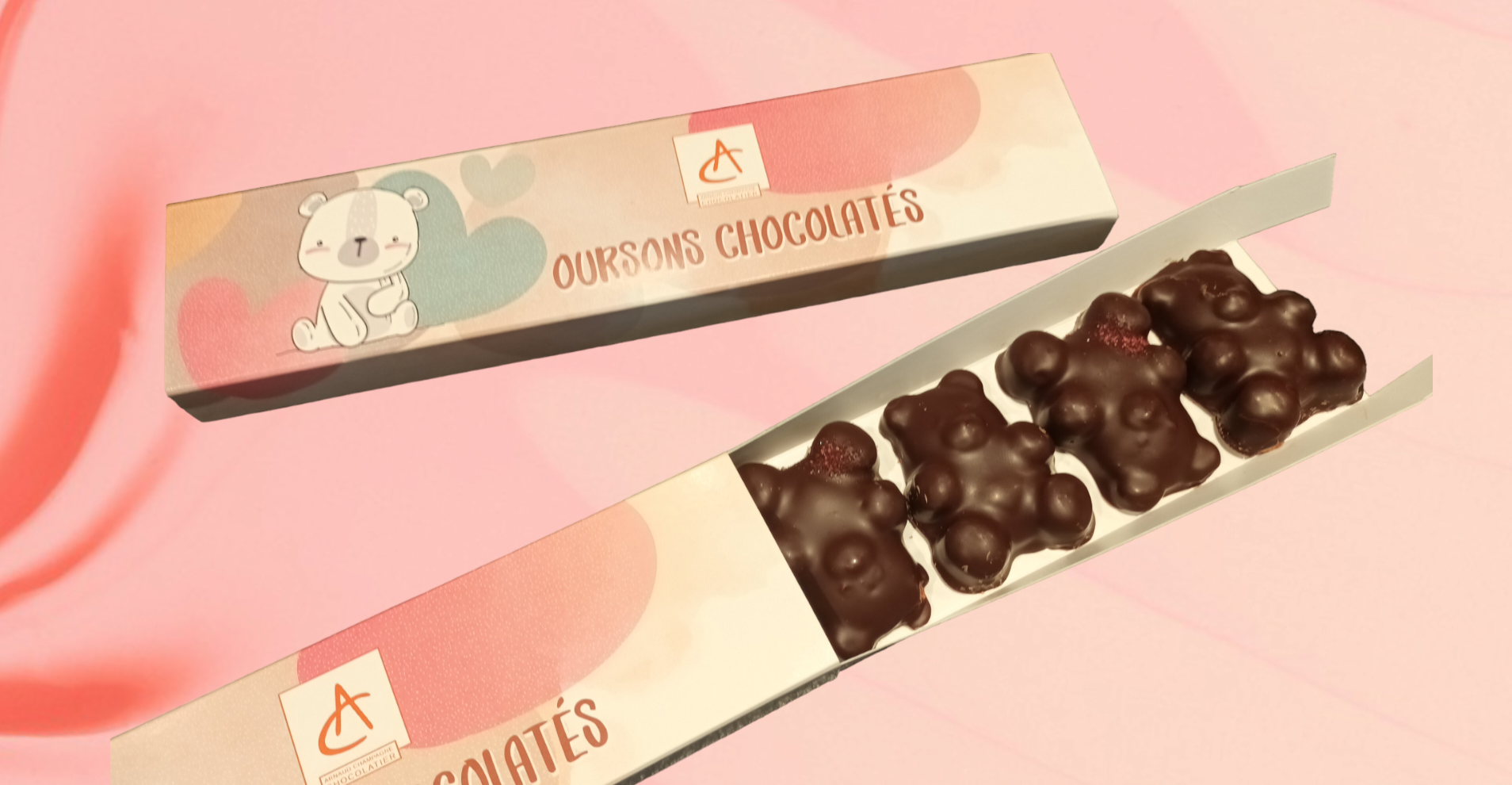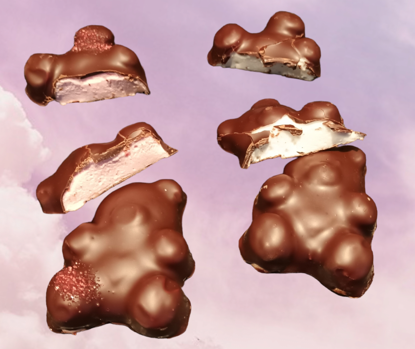 Réglette de 6 oursons à la guimauve : 2 vanille et 2 framboise (enrobage en chocolat fondant) et 2 spéculoos (enrobage en chocolat lait)