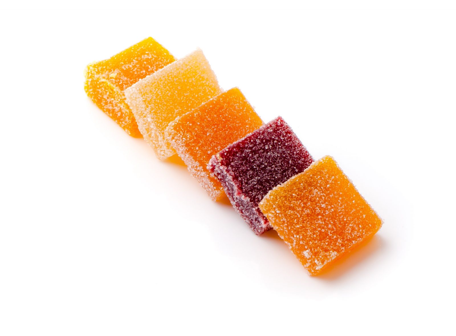 Pâte de fruits, cube composé d’un assortiment des différents goûts.