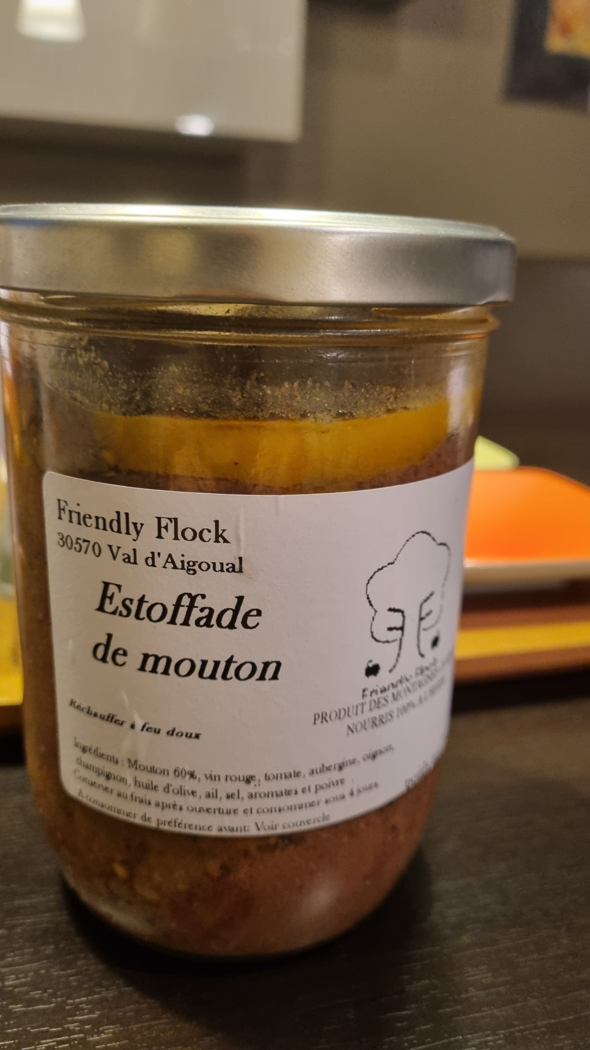 Mouton (60%) - Vin rouge - Tomate - Aubergine - Oignon - Champignon - Huile d'olive – Ail - Poivre – Sel - Aromates